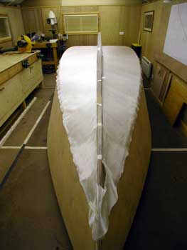 Next I cut the first two pieces of fibreglass cloth for the hull sheathing.