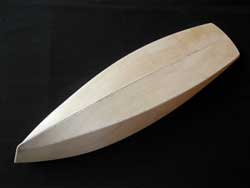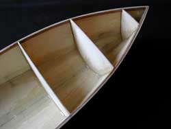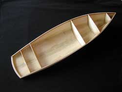 This month sees the completion of the 12th scale hull. Once all the panels are stitched together the sheer is held at the correct shape with some short lengths of wood. Then the bulkheads (frames) are fitted, size checked and glued into position. The structure is now quite rigid and all the panel interfaces can be glass/epoxy taped. Finally the stitches are taken out and this is the result.....